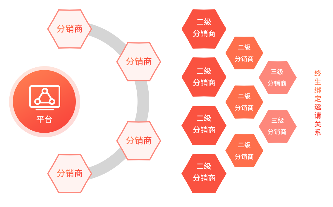 商品链接或海报、个人推广链接或海报,个人推荐码注册、分享平台优惠券均可建立短期和长期的推荐关系,还能招募分销商团。